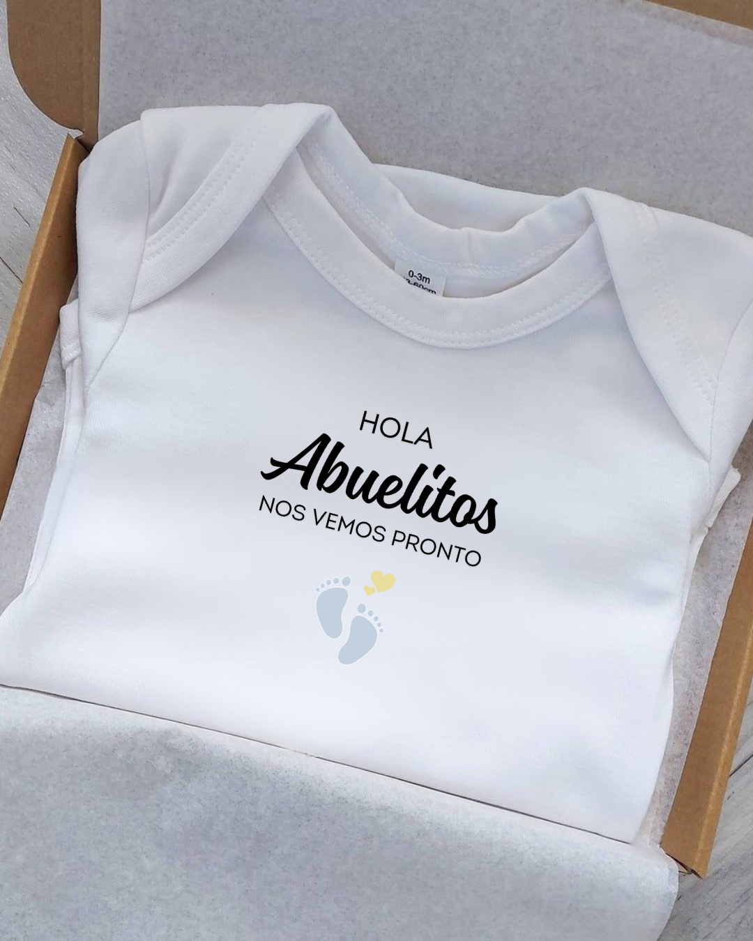 La forma más tierna y original de dar la gran noticia: una caja sorpresa con body de bebé y tarjeta especial para emocionar a los futuros abuelos. 💕
