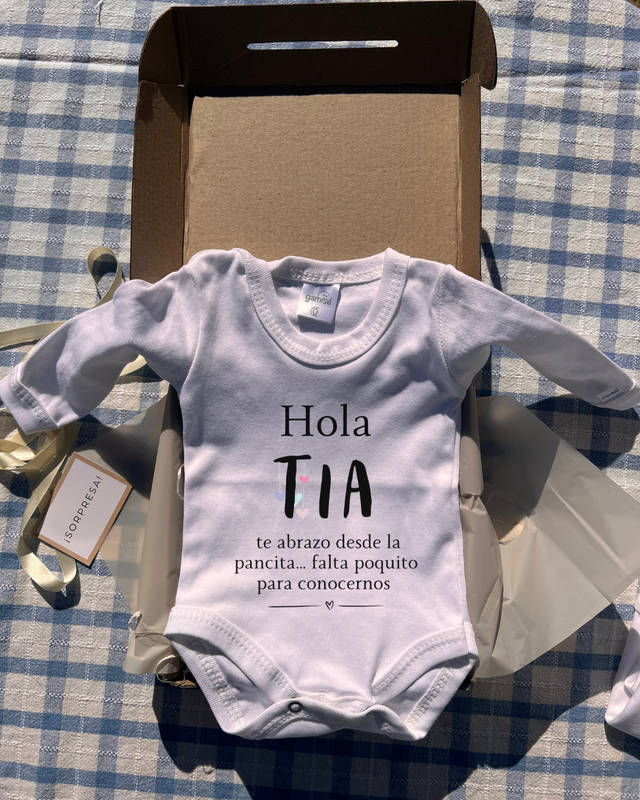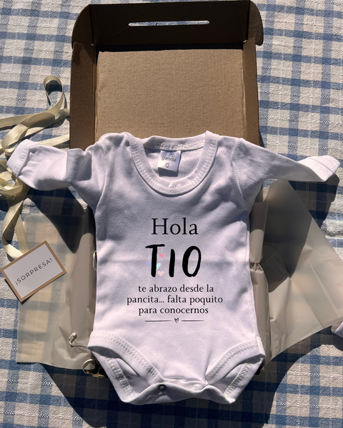 La forma más dulce de contar la noticia: una caja sorpresa con body para emocionar a los futuros tíos. 💝 Ver más detalles